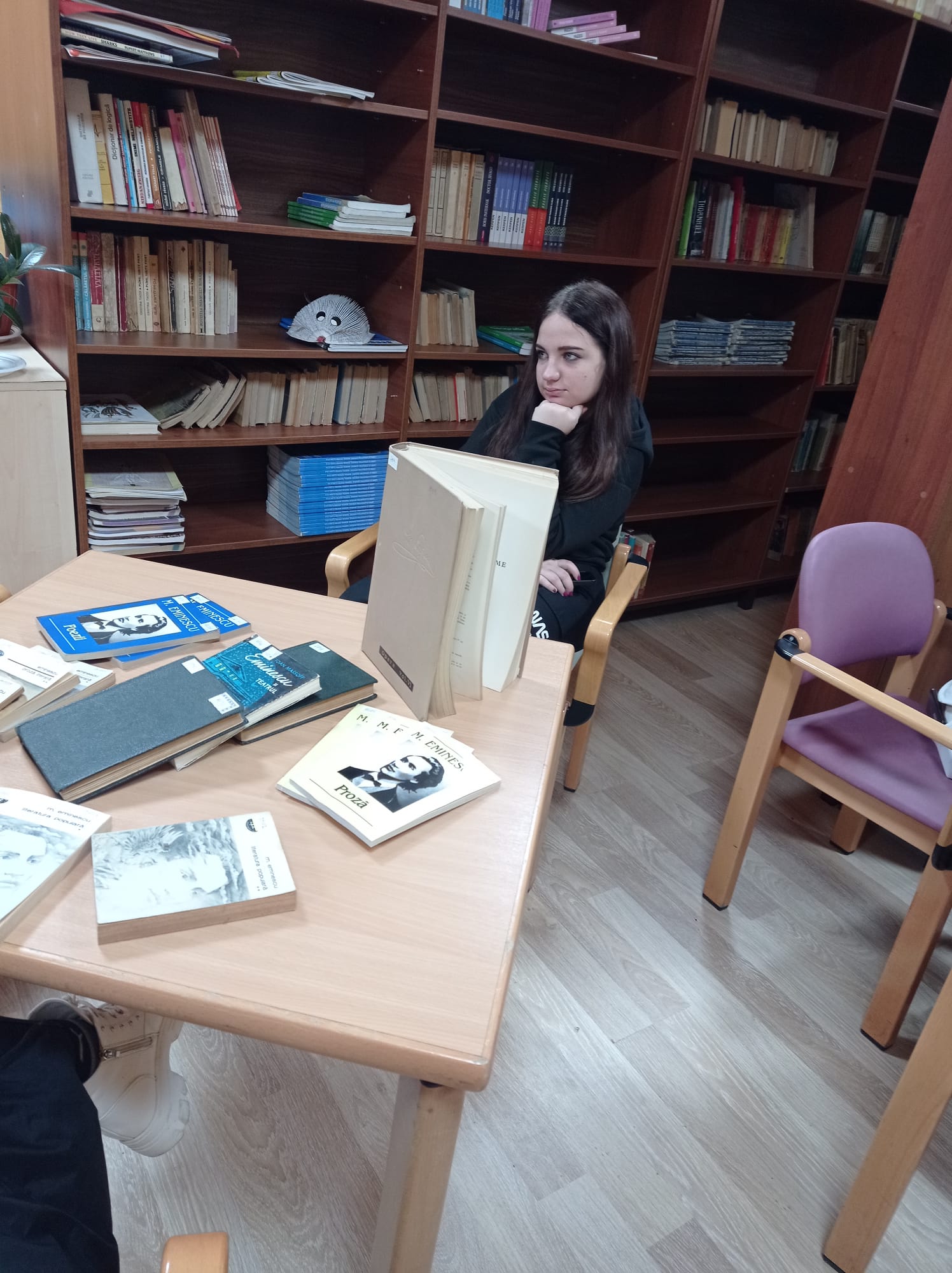 In partea a doua, elevii au fost condusi la biblioteca unitatii de invatamant unde activitatea s-a axat doar pe "Luceafarul poeziei romanesti" - Mihai Eminescu. Avand ca fond muzical melodia "Eminescu" compusa si interpretata de sotii Doina si Ioan Aldea Teodorovici din Basarabia, au recitat din lirica eminesciana elevele: