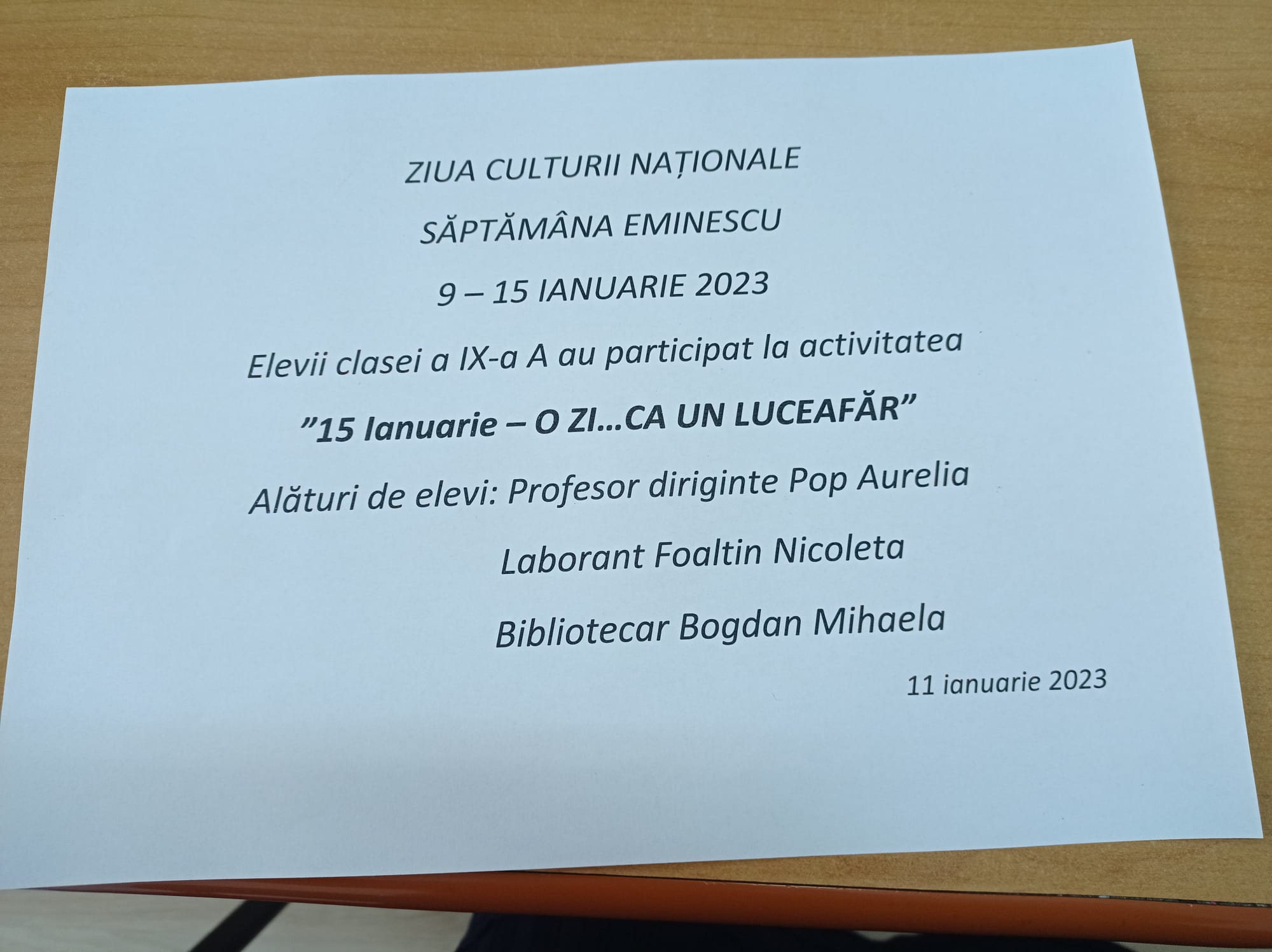 elevii clasei a IX-a A, au participat la activitatea '15 ianuarie - o zi ca un luceafar' organizata in cadrul saptamanii Eminescu (9-15.01.2023) si Ziua Culturii Nationale